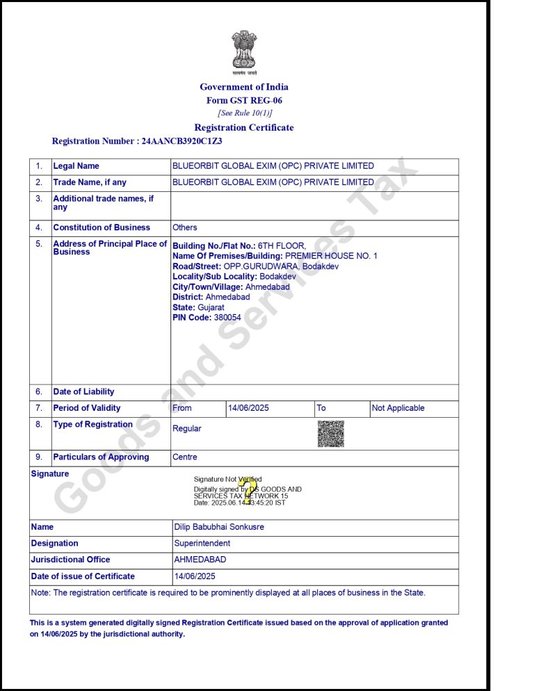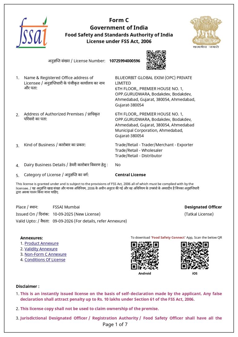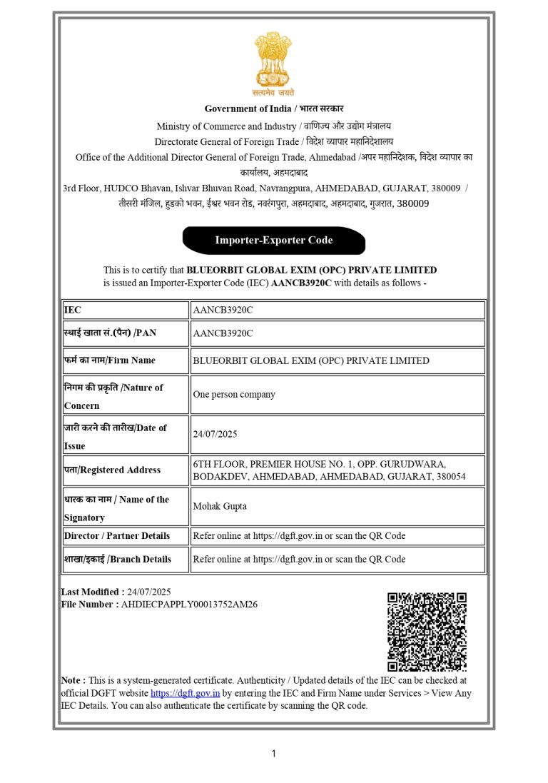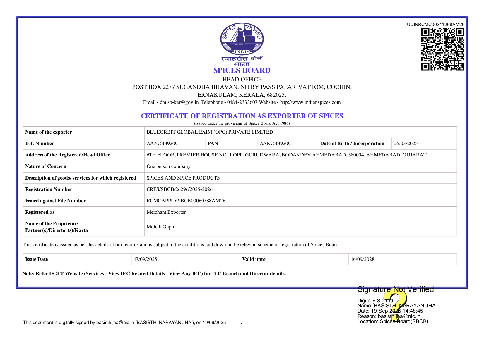 BlueOrbit Global EXIM OPC Pvt Ltd is duly registered with the relevant Government of India authorities, holding all mandatory certifications and licenses required for international trade in agricultural and spice products.
